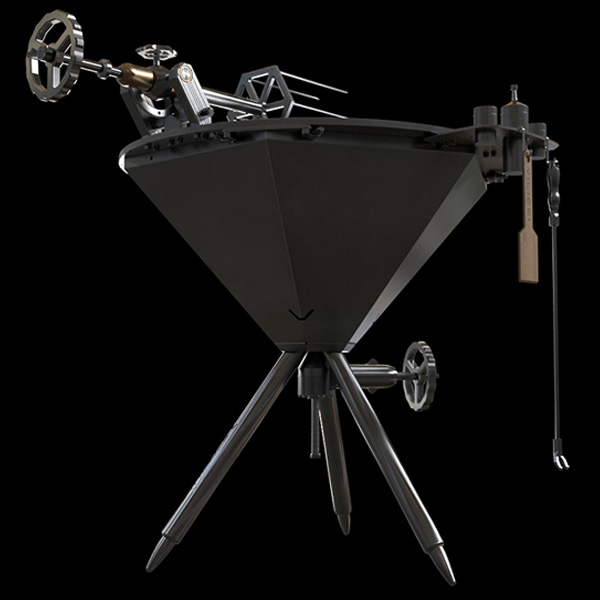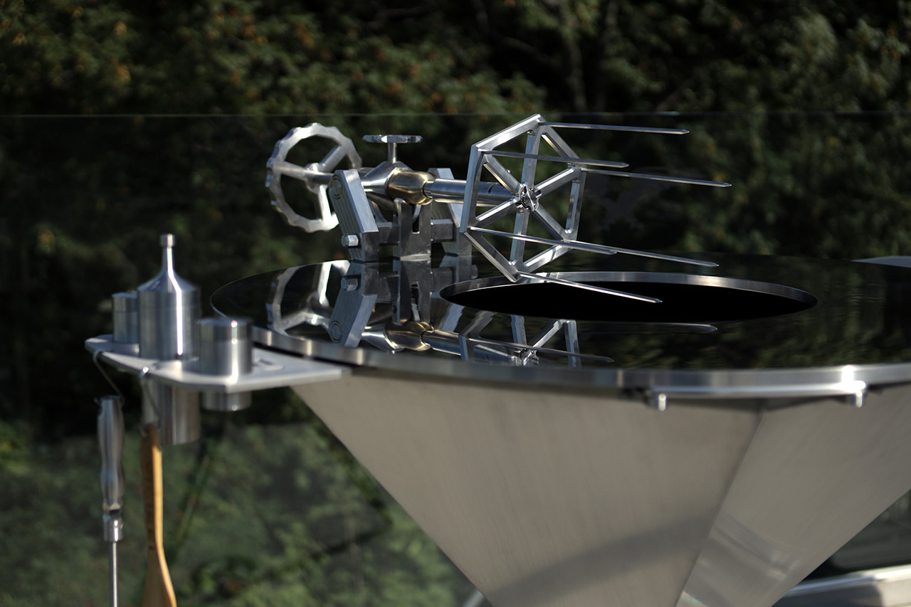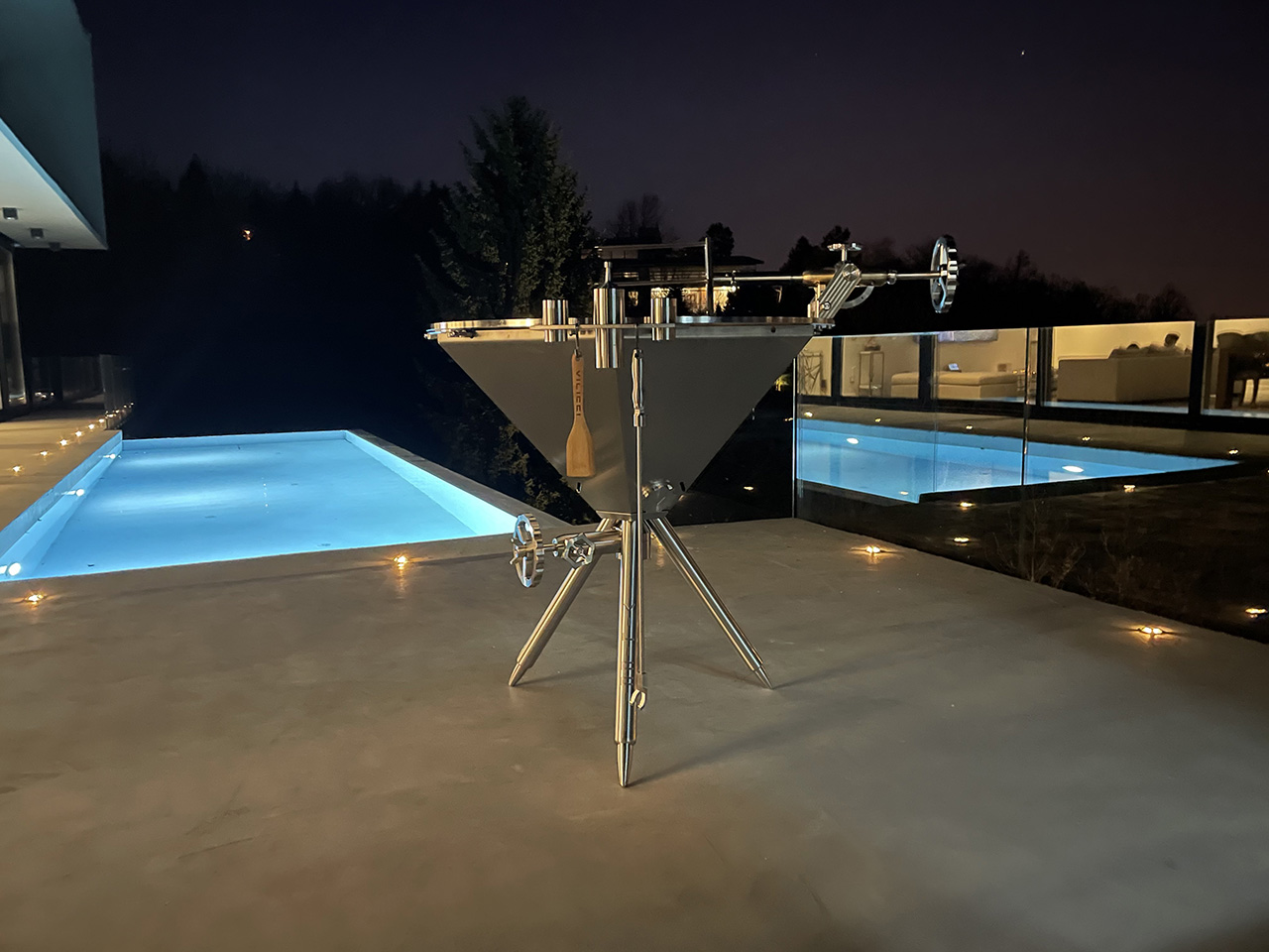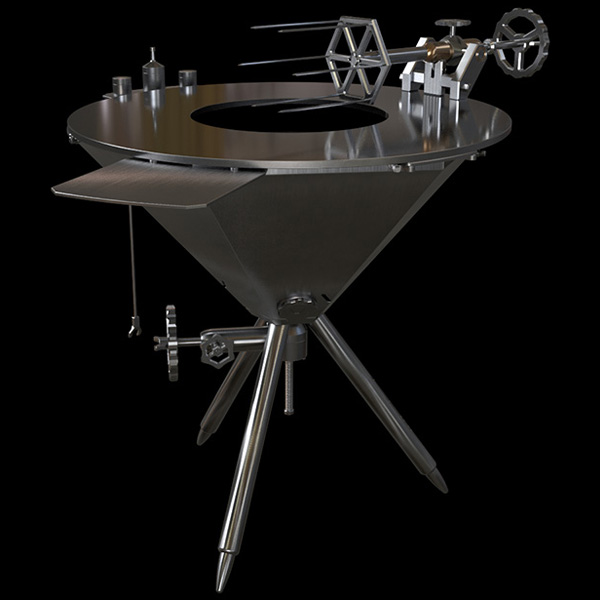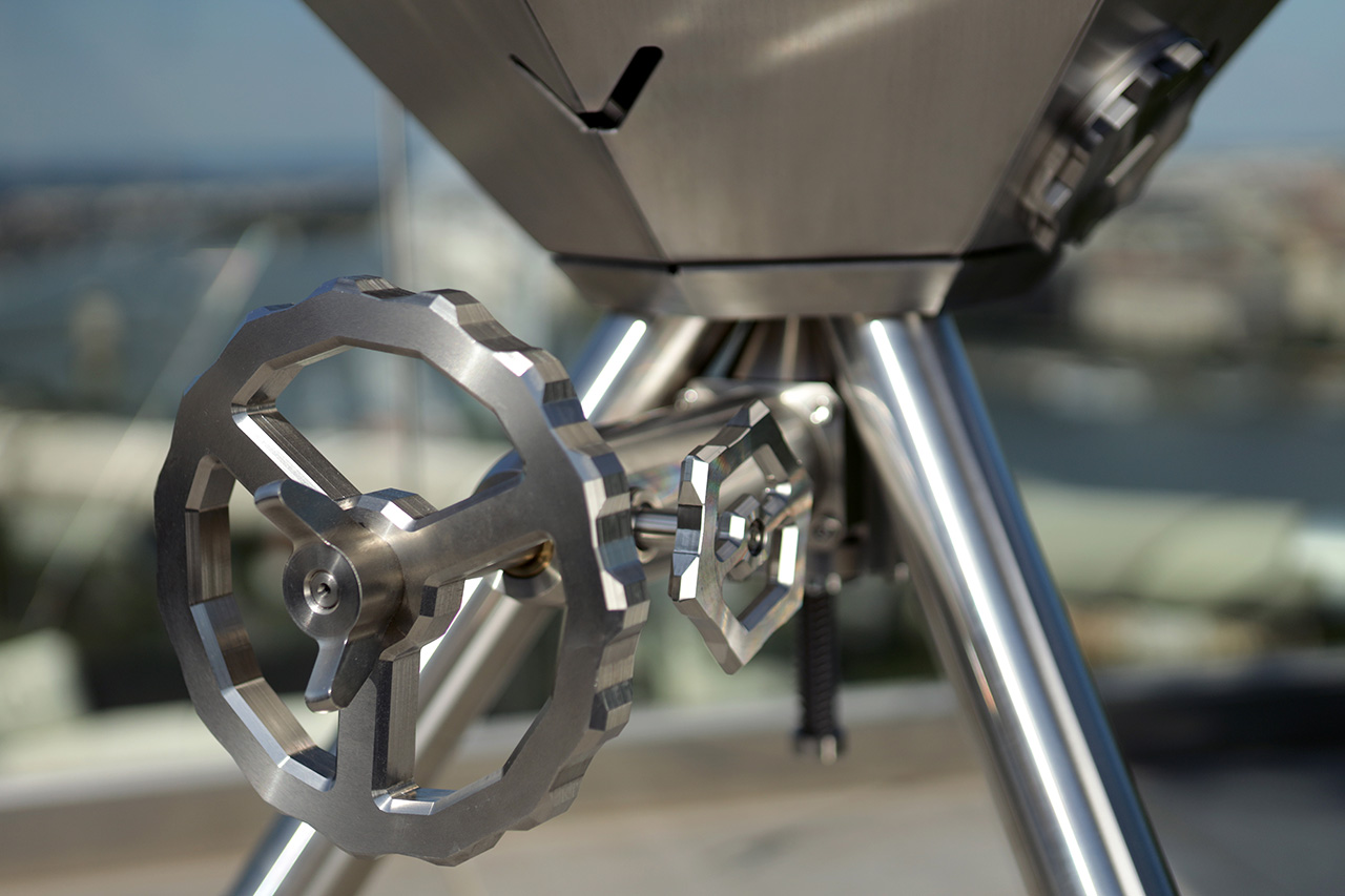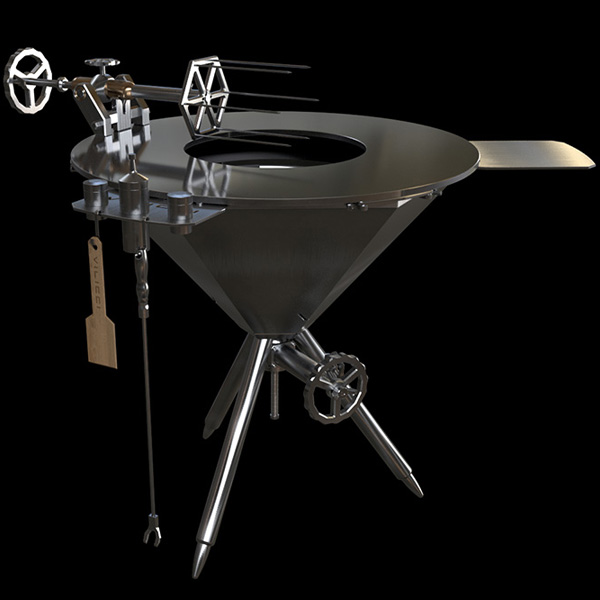 The rotisserie unit can be safely placed on or removed from the grill by opening a sturdy deadbolt latch. This makes it easy to load the rotisserie with up to 5 lbs of meat. You can of course, rotate the skewer rotisserie, or lock it in place and adjust its angle up to 90 degrees when needed. Skewers can also be individually removed from the rotisserie. The ½’ inch thick cooktop will never deform from heat and is slightly slanted towards the inside, so grease will never drip on the ground, and all remaining residue can be easily scraped off into the fire. Emptying ash from the fire chamber is very easy due to the convenient vacuum cleaner port.